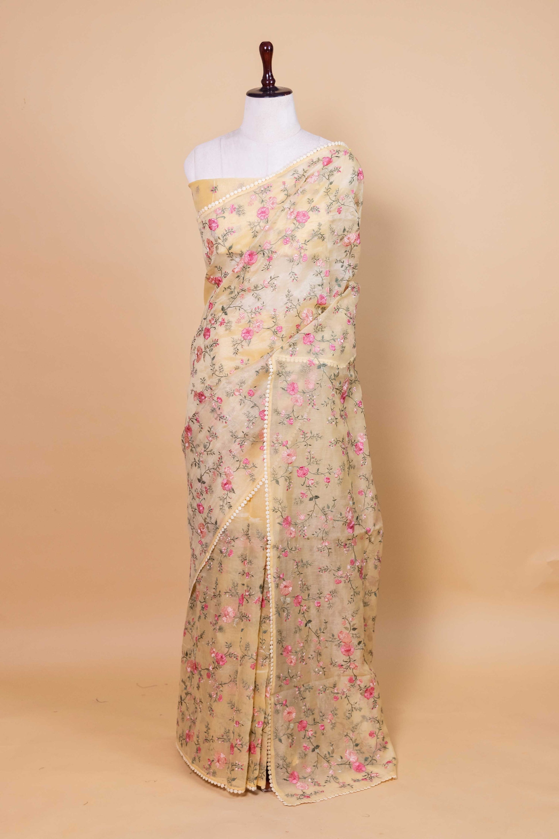 Yellow Floral Embroidered Chanderi Tissue Saree