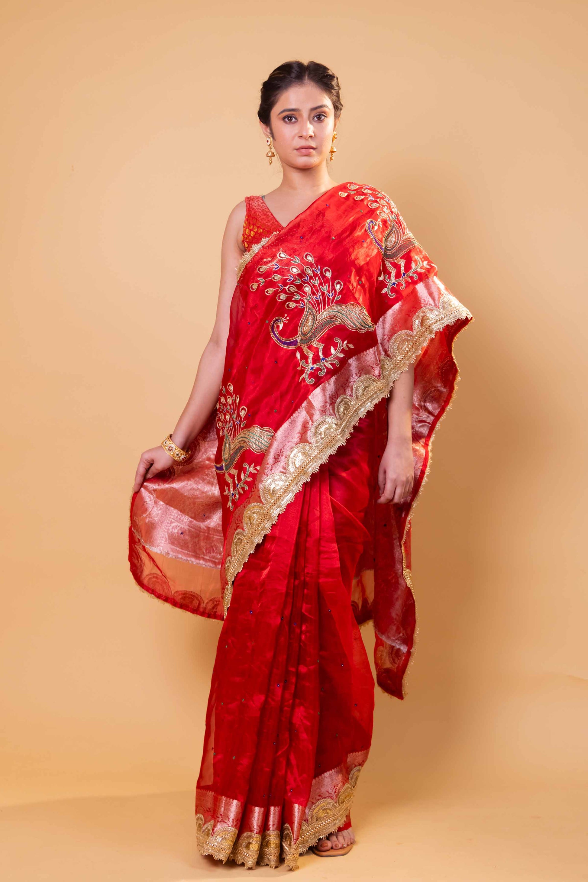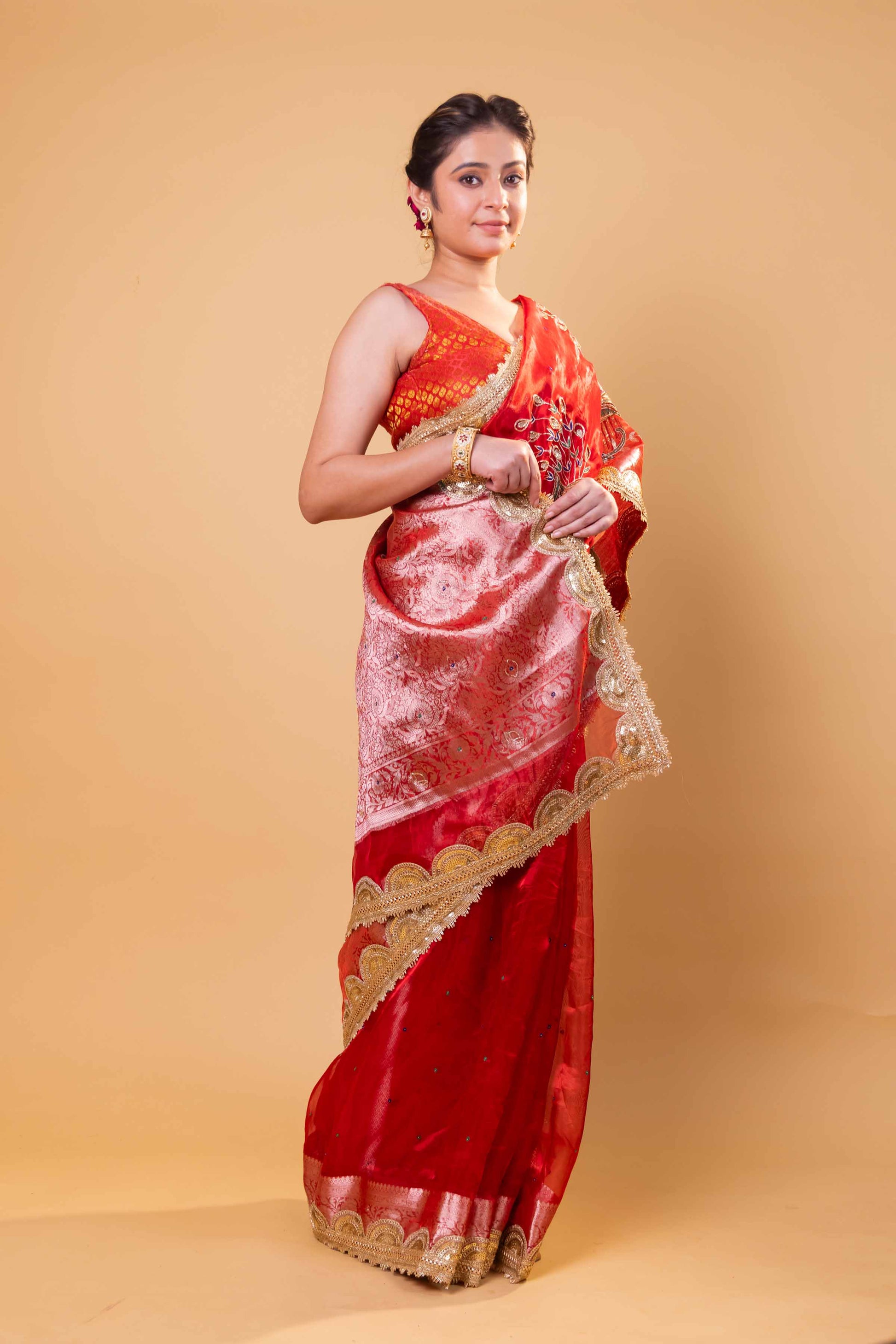A luxurious red Tissue Silk saree crafted from soft, lightweight fabric, featuring exquisite hand embroidery with cut daana, moti, and gota patti work. The water zari embellished border and richly woven pallu enhance its regal charm. Comes with a matching brocade blouse—perfect for festive and celebratory occasions.