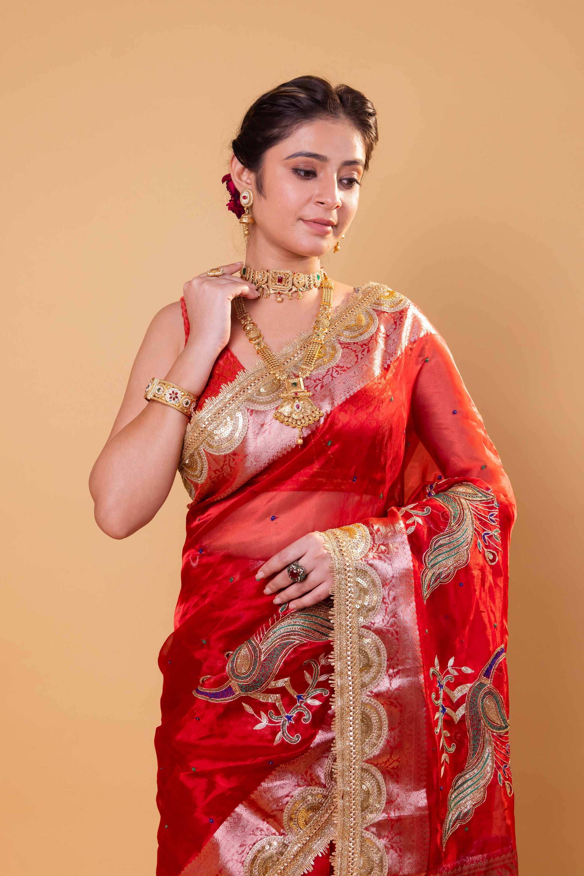 Red Hand-Embroidered Tissue Silk Saree with Embellished Border
