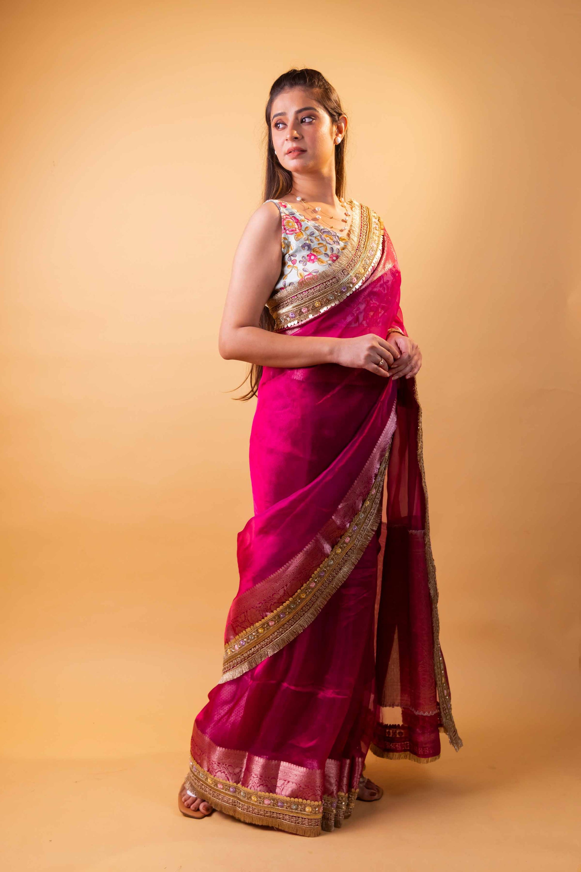 A luxurious Pure Soft Tissue Silk saree in elegant rani pink, featuring a beautifully rich weaving pallu and a refined water zari weaving border. The soft, lightweight drape is enhanced with delicate embellished lace detailing. Paired with a stunning brocade blouse, it offers a perfect blend of elegance and festive charm.