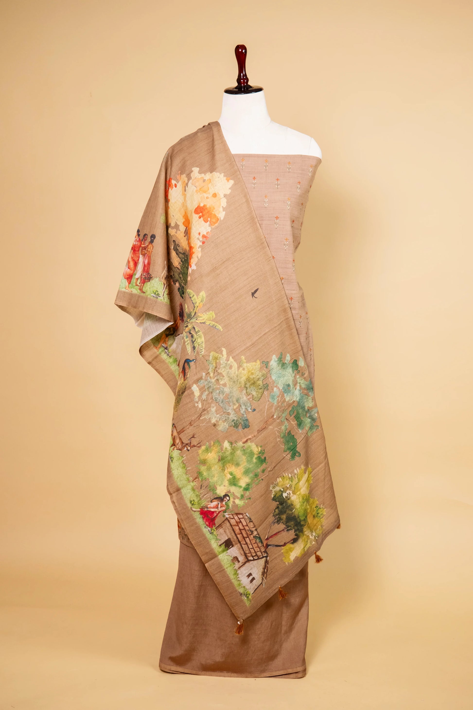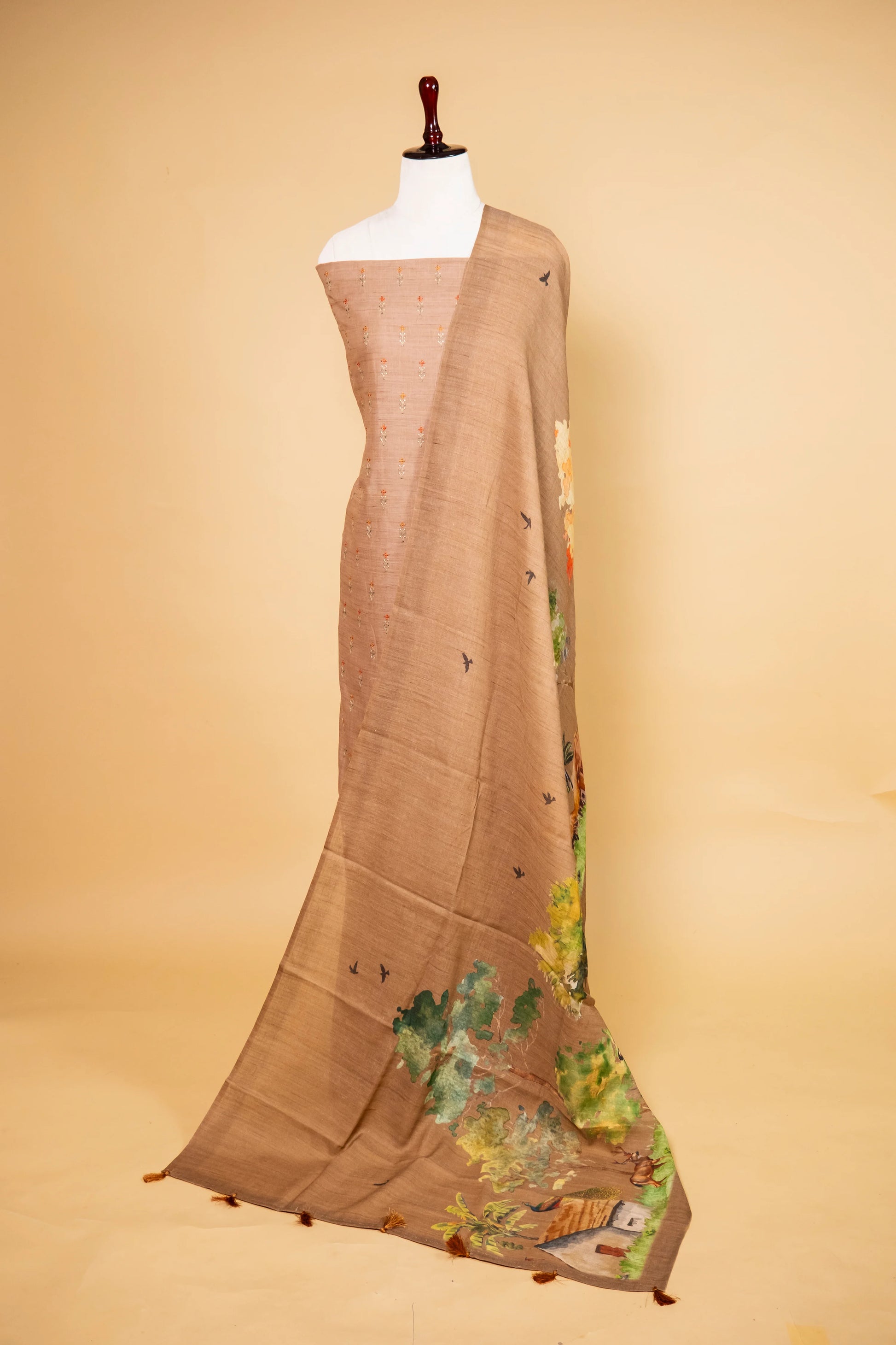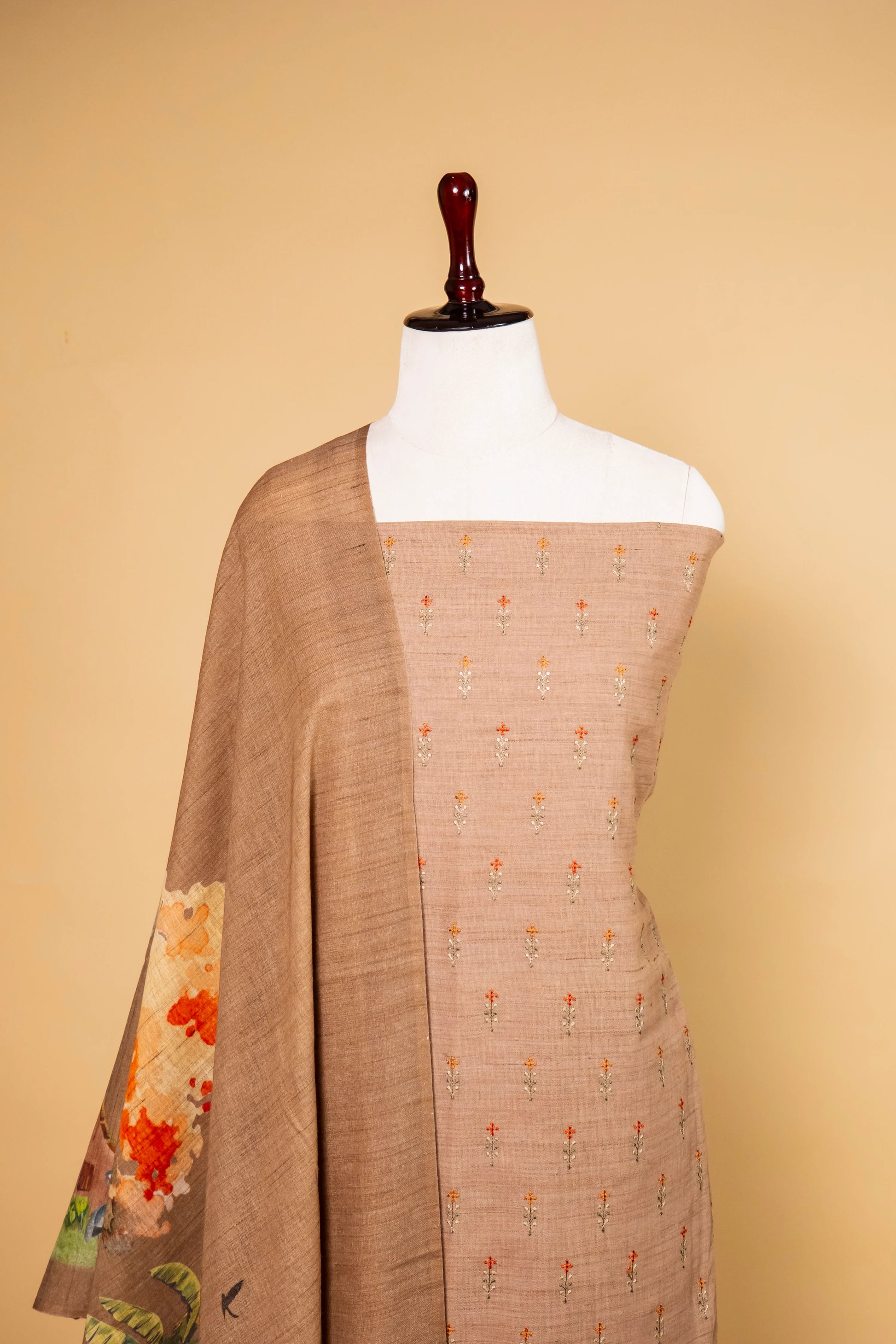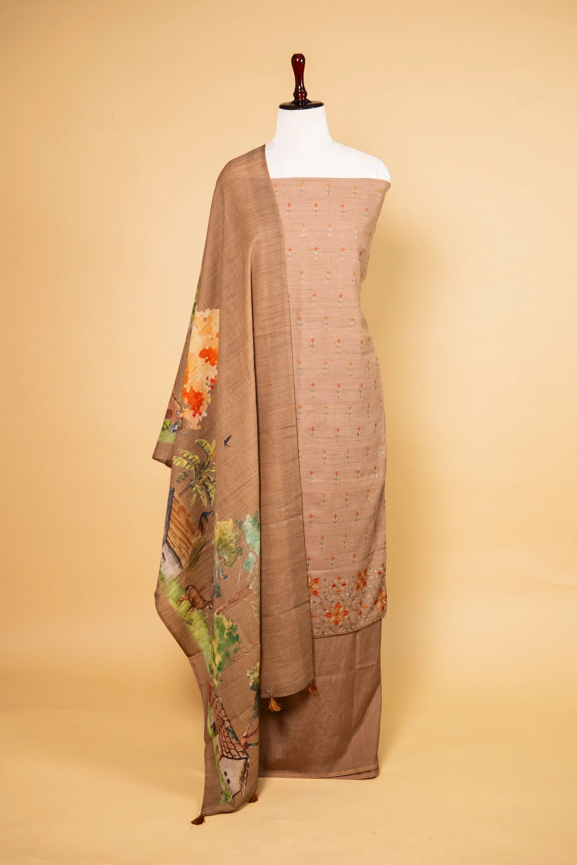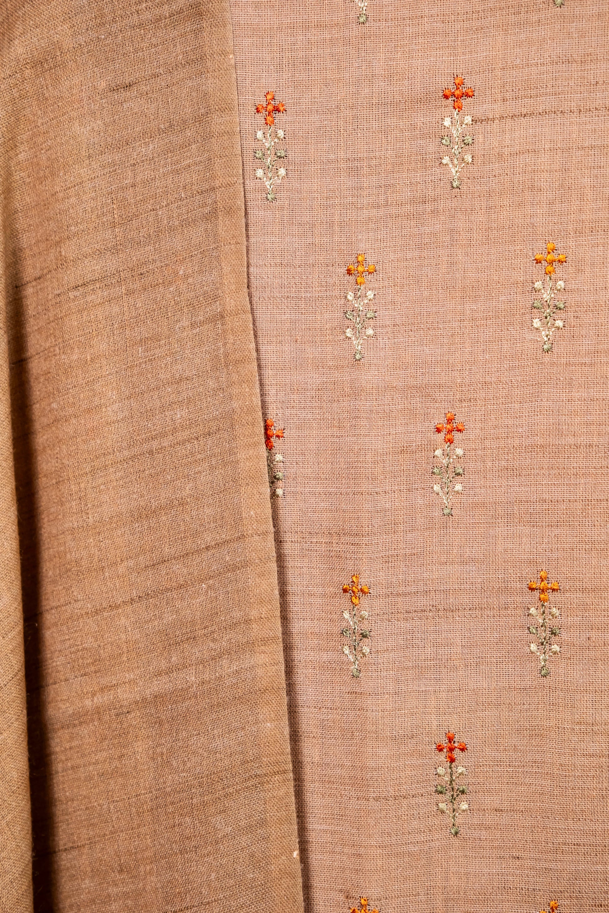 Add a touch of timeless elegance with this Brown Matka Linen Embroidered Suit, showcasing delicate floral thread work on the kurta. Complemented by a digitally printed dupatta with charming tassels and a plain matka linen bottom, this ensemble effortlessly fuses traditional grace with modern flair—ideal for festive or casual occasions.