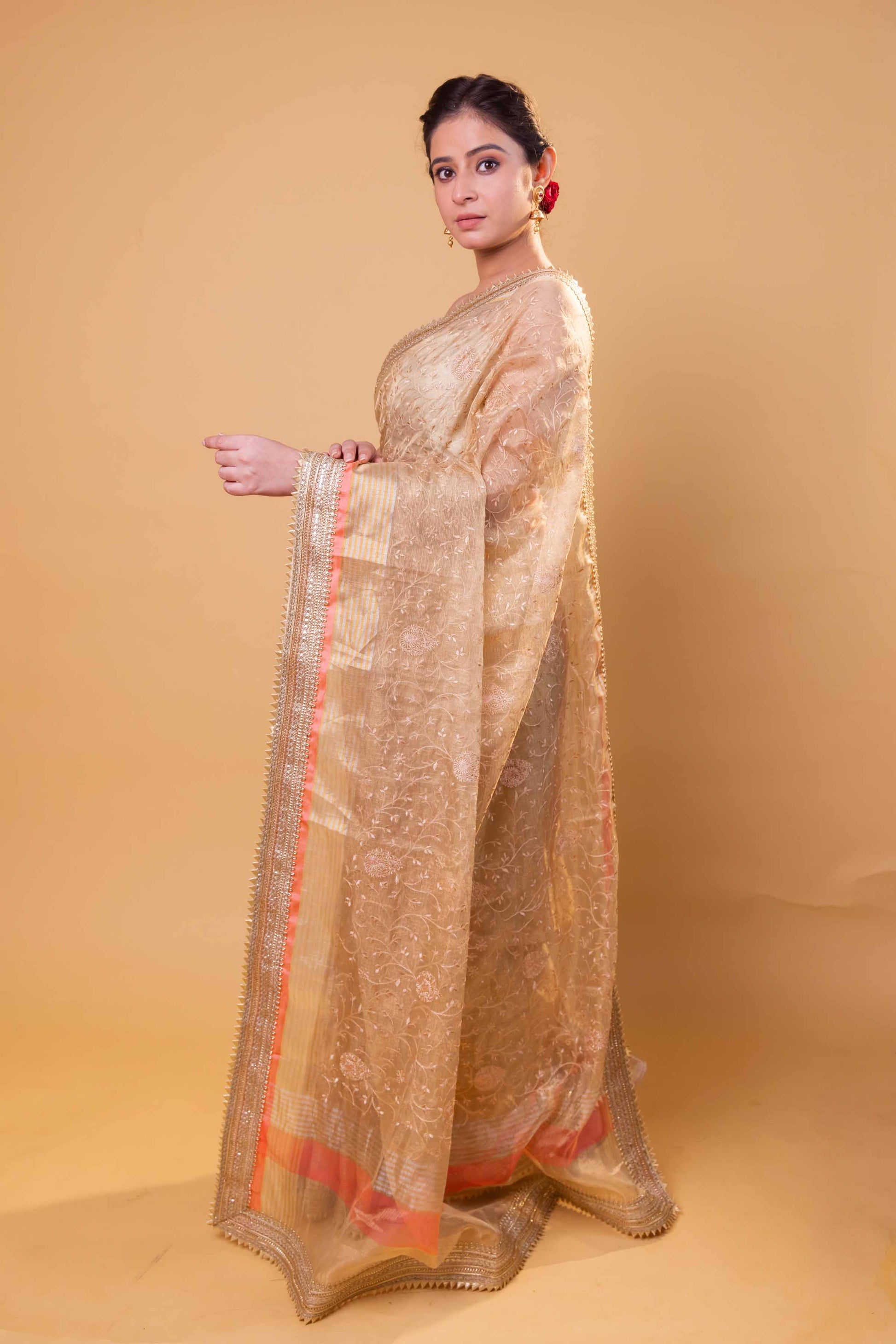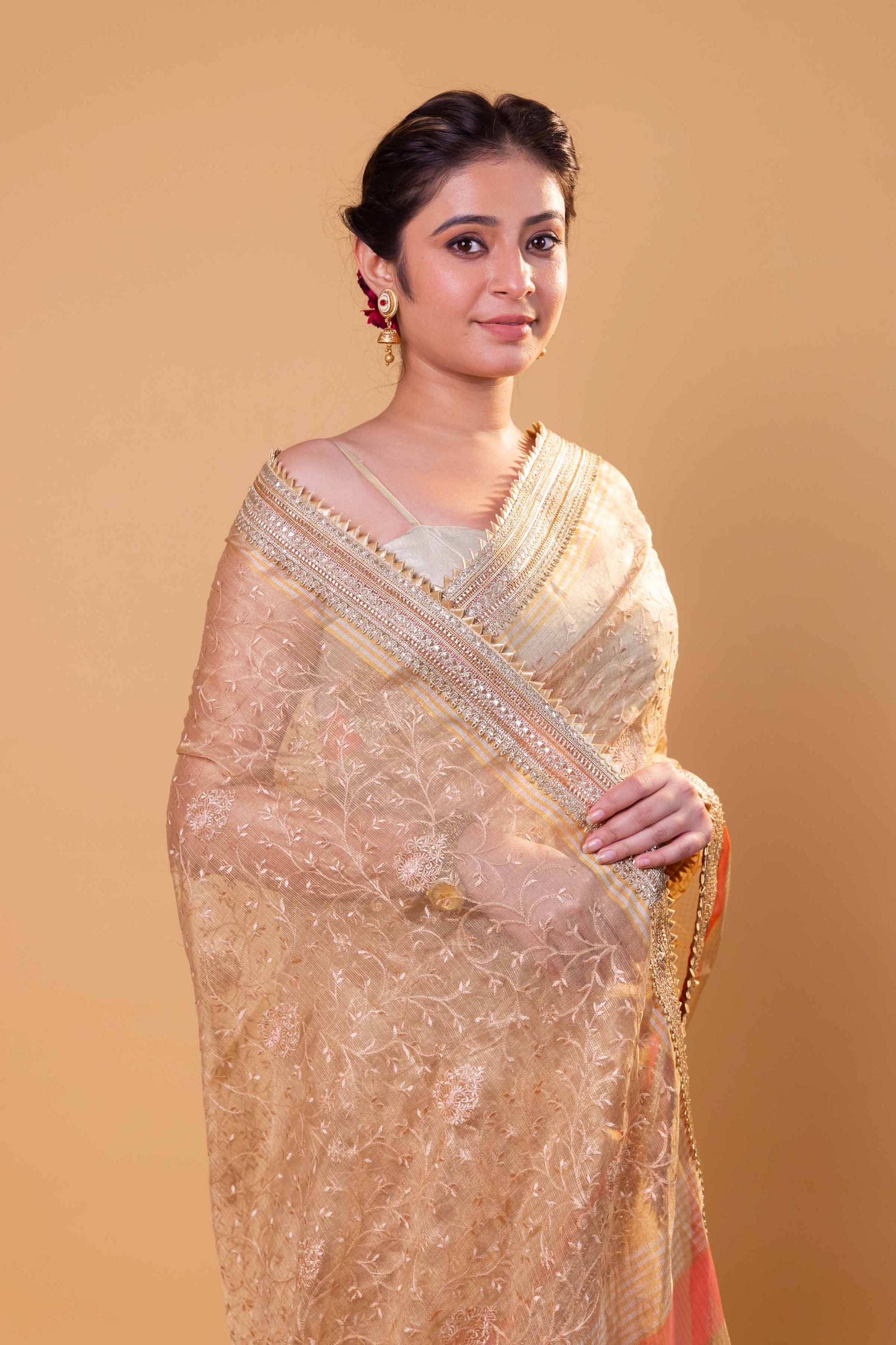 Beige Embroidered Tissue Silk Saree with Embroidery Lace