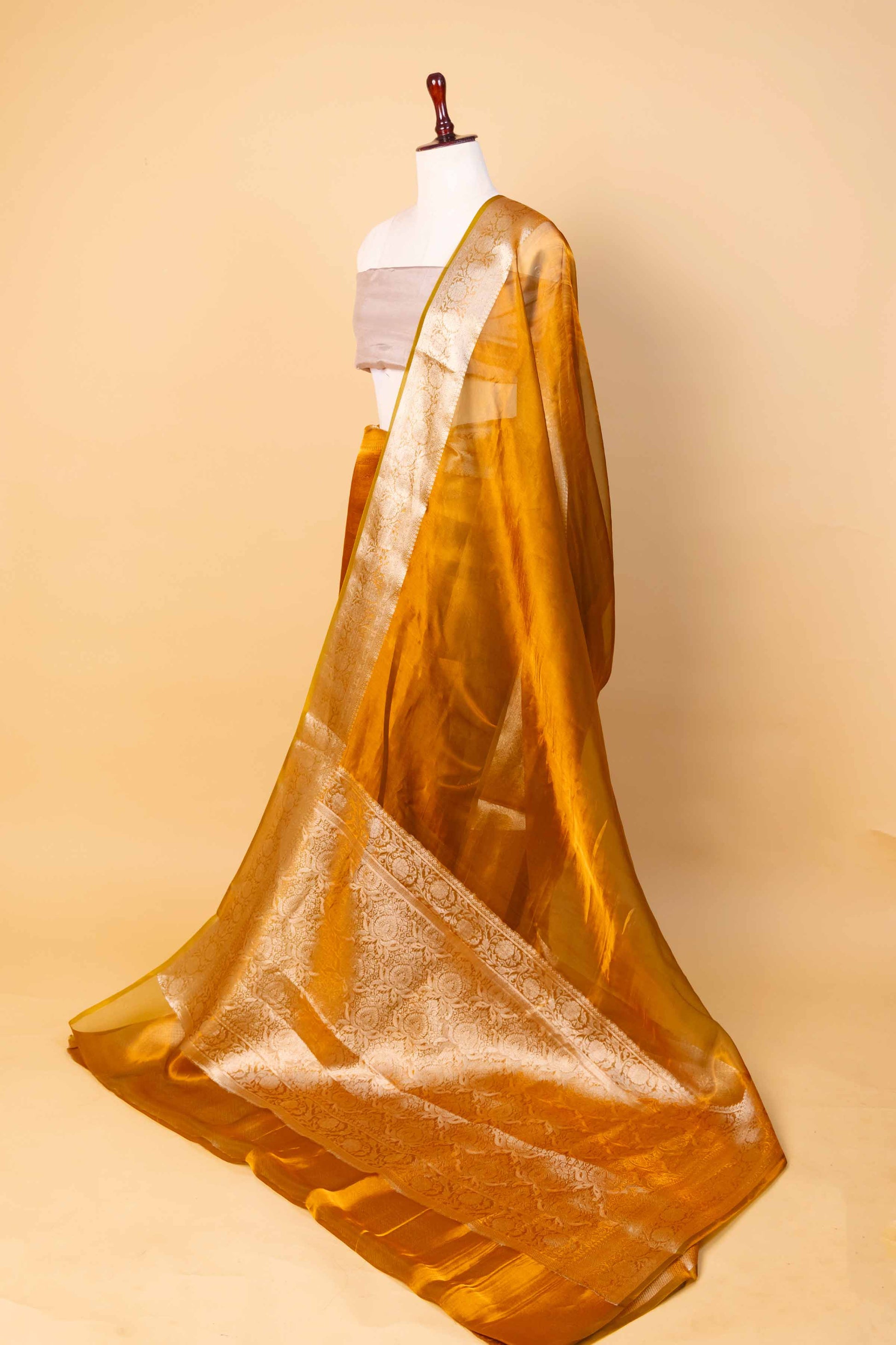 A graceful Pure Soft Tissue Silk saree in a radiant mustard shade, crafted with soft, lightweight fabric and a beautifully detailed rich weaving pallu. The water zari weaving border adds a subtle, elegant sheen. Paired with an exquisite brocade blouse, it offers a refined and timeless festive look.