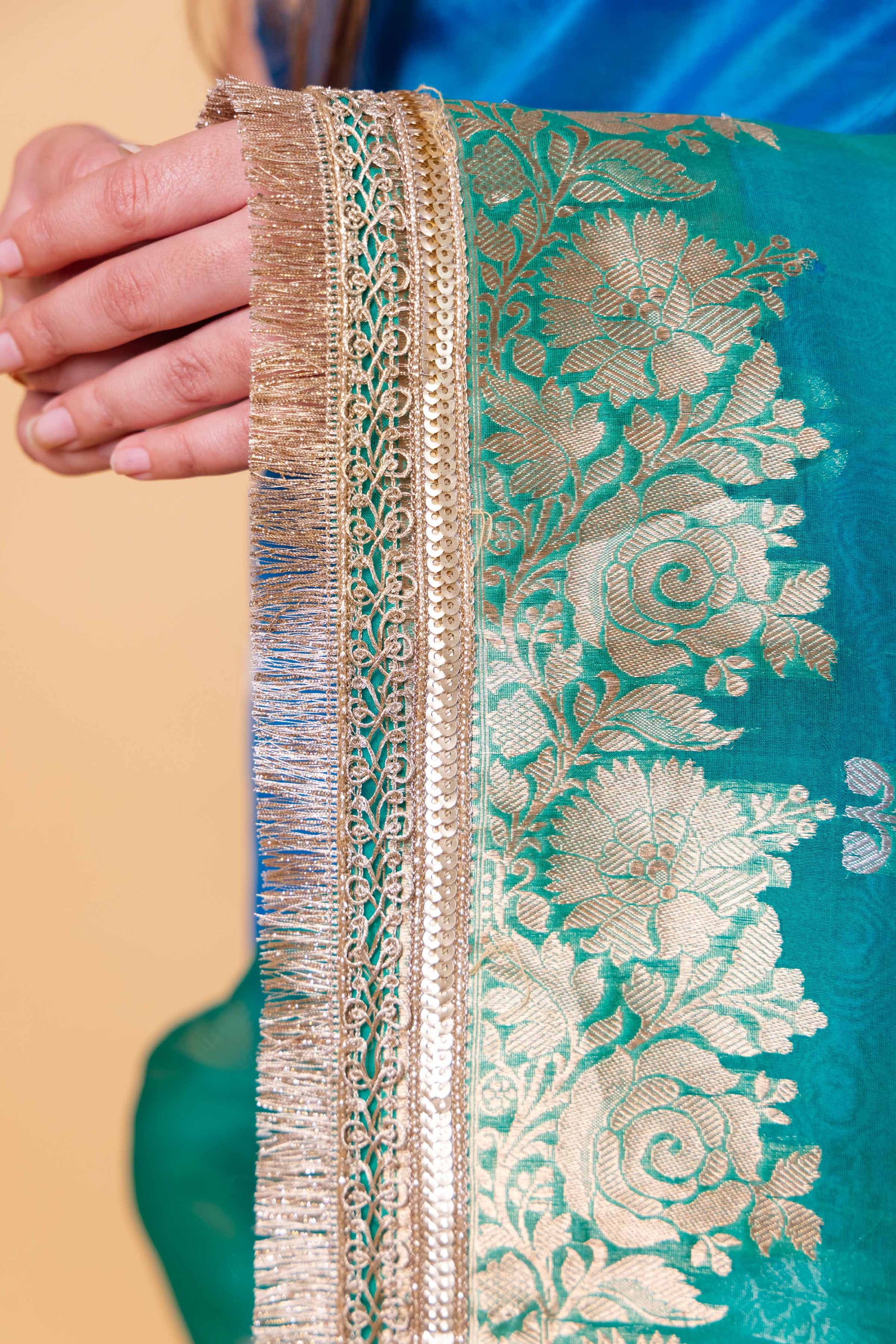 Green & Blue Shaded Kadhua Organza Silk Saree with Embellished Border