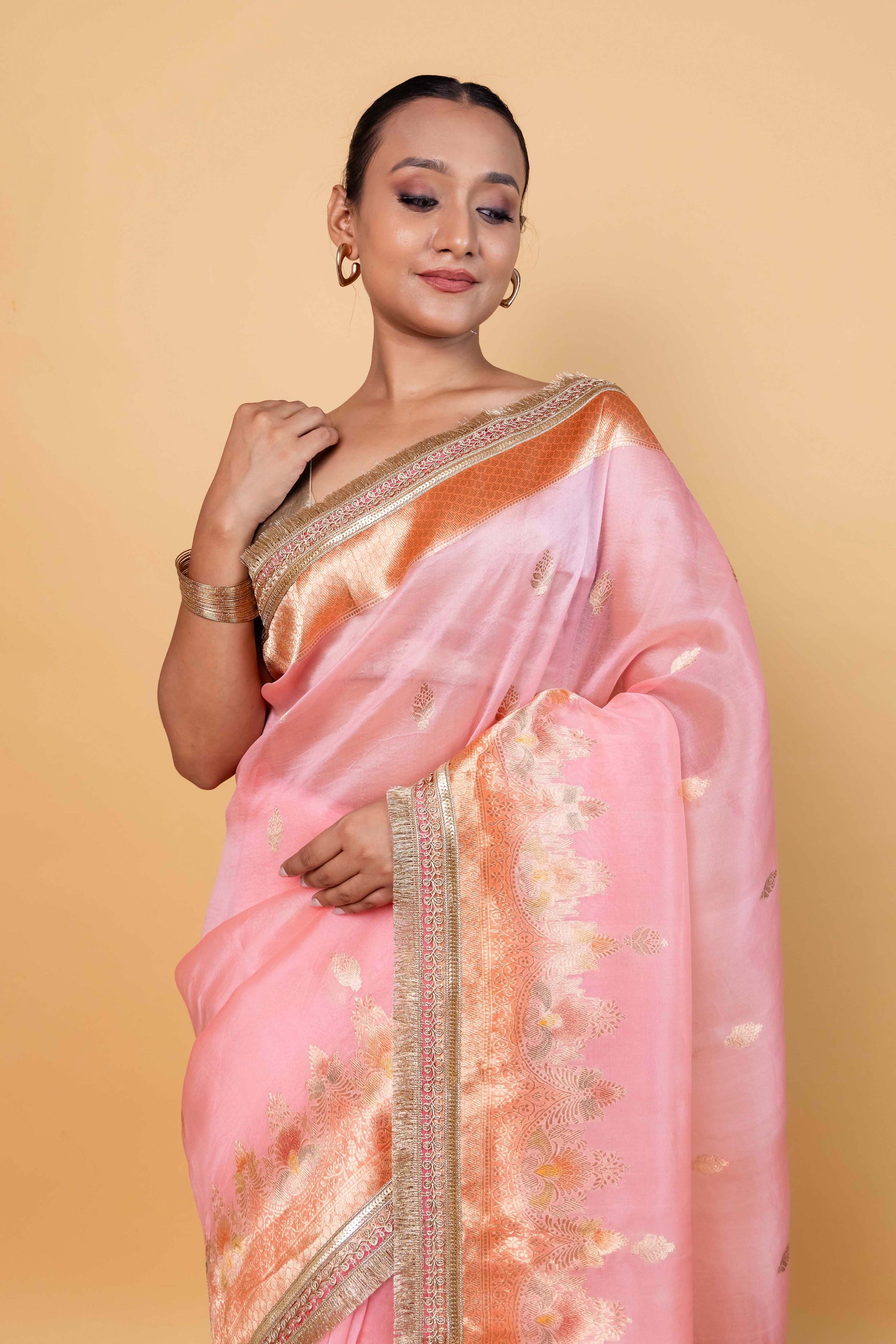 Peachy Pink Meenakari Organza Silk Saree — A stunning Banarasi Hub masterpiece, featuring intricate water zari floral weaving and traditional Meenakari hand dye artistry. The saree is adorned with an elegant embroidered lace border and a richly woven pallu, blending timeless Banarasi craftsmanship with graceful sophistication.