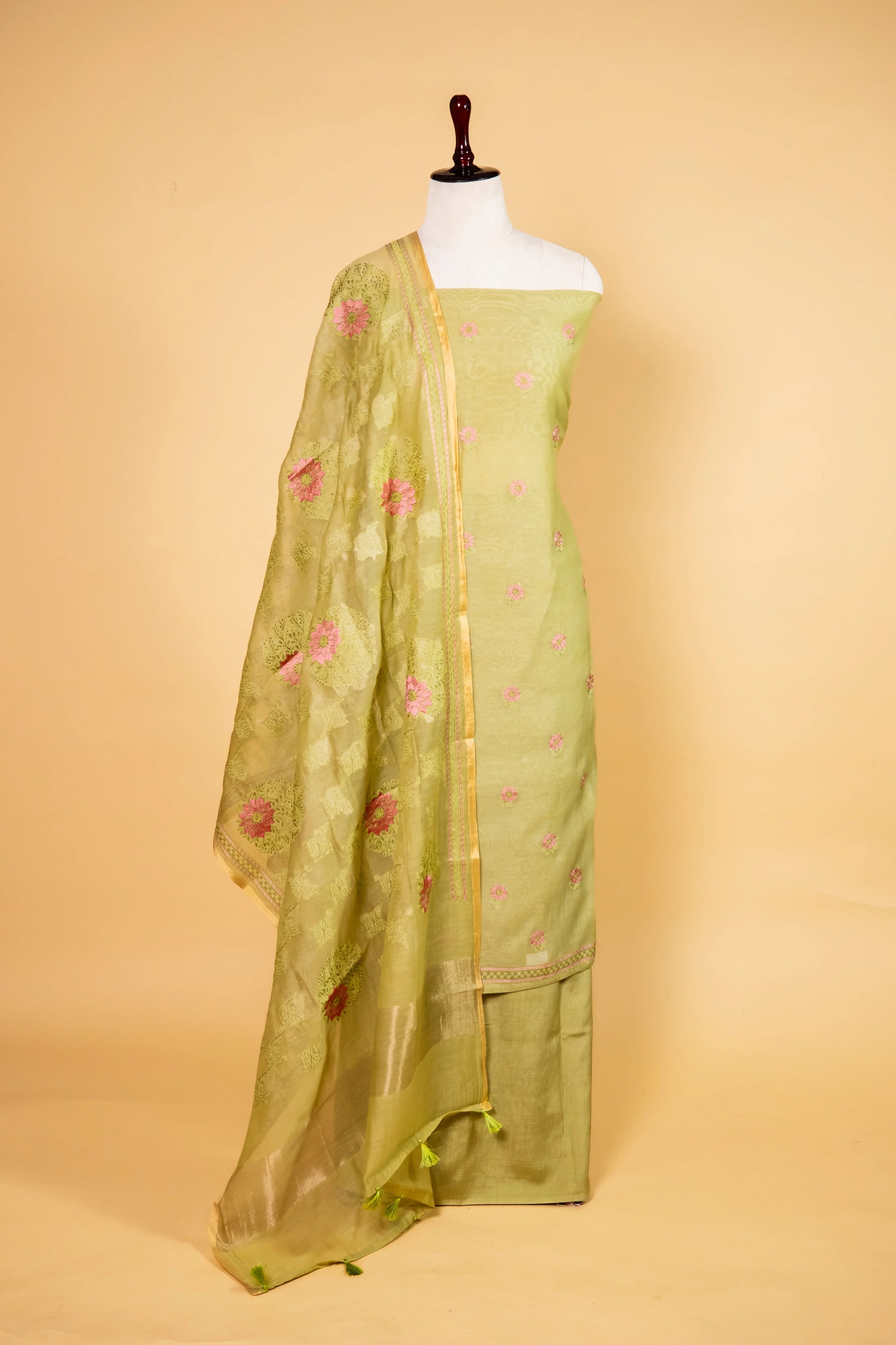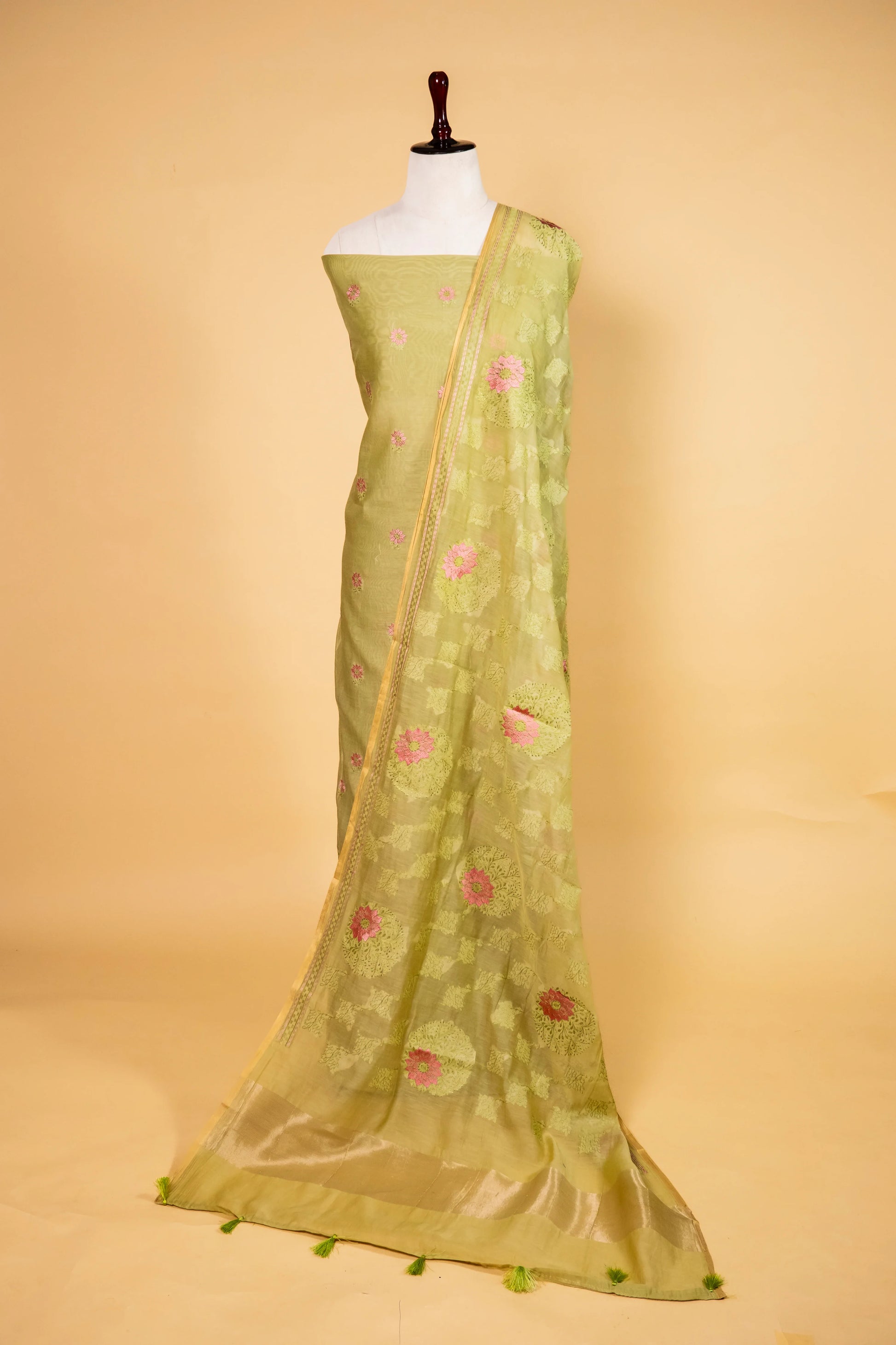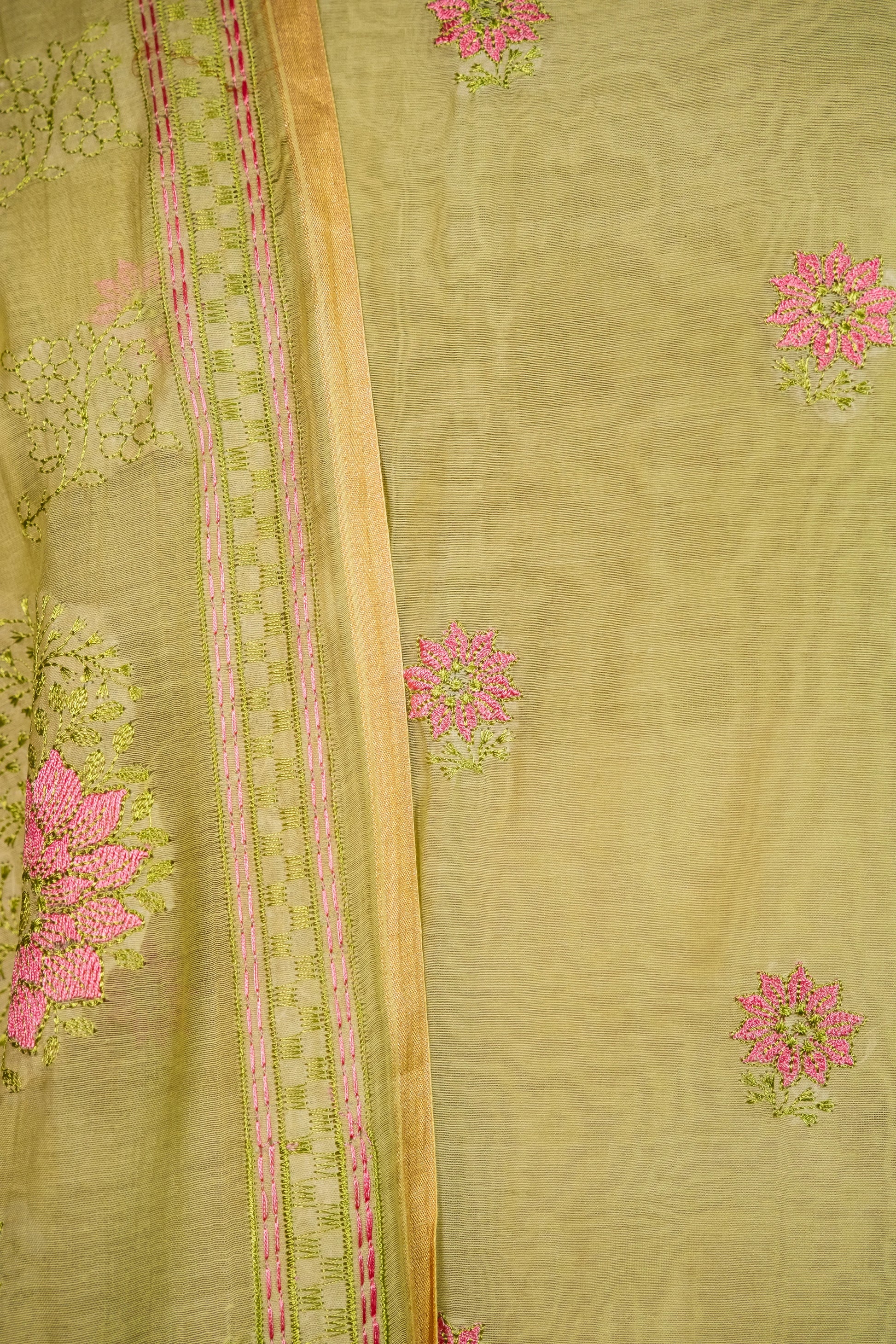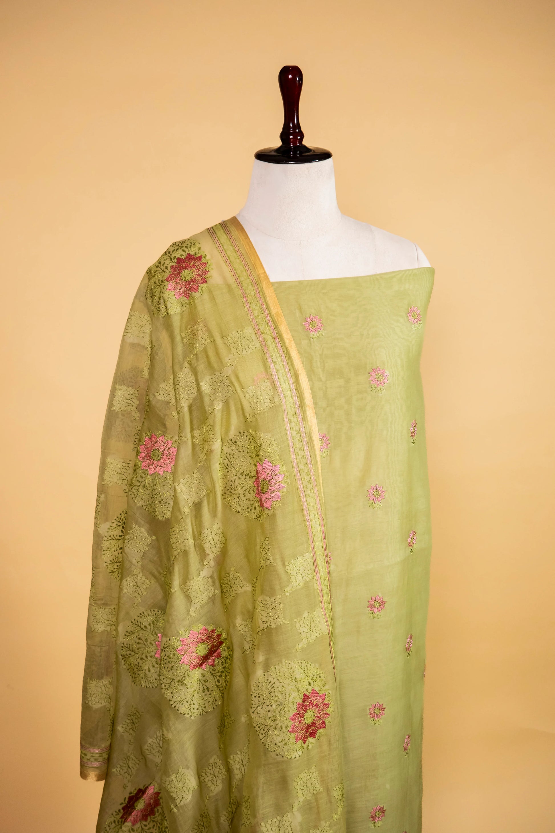Looking for a fresh, vibrant ethnic outfit? This Liril Green Embroidered Mul Cotton Suit features multicolor resham floral thread work on the kurta, paired with a heavily embroidered floral dupatta adorned with tassels. Completed with a soft cotton bottom, it’s perfect for festive days and elegant summer gatherings.