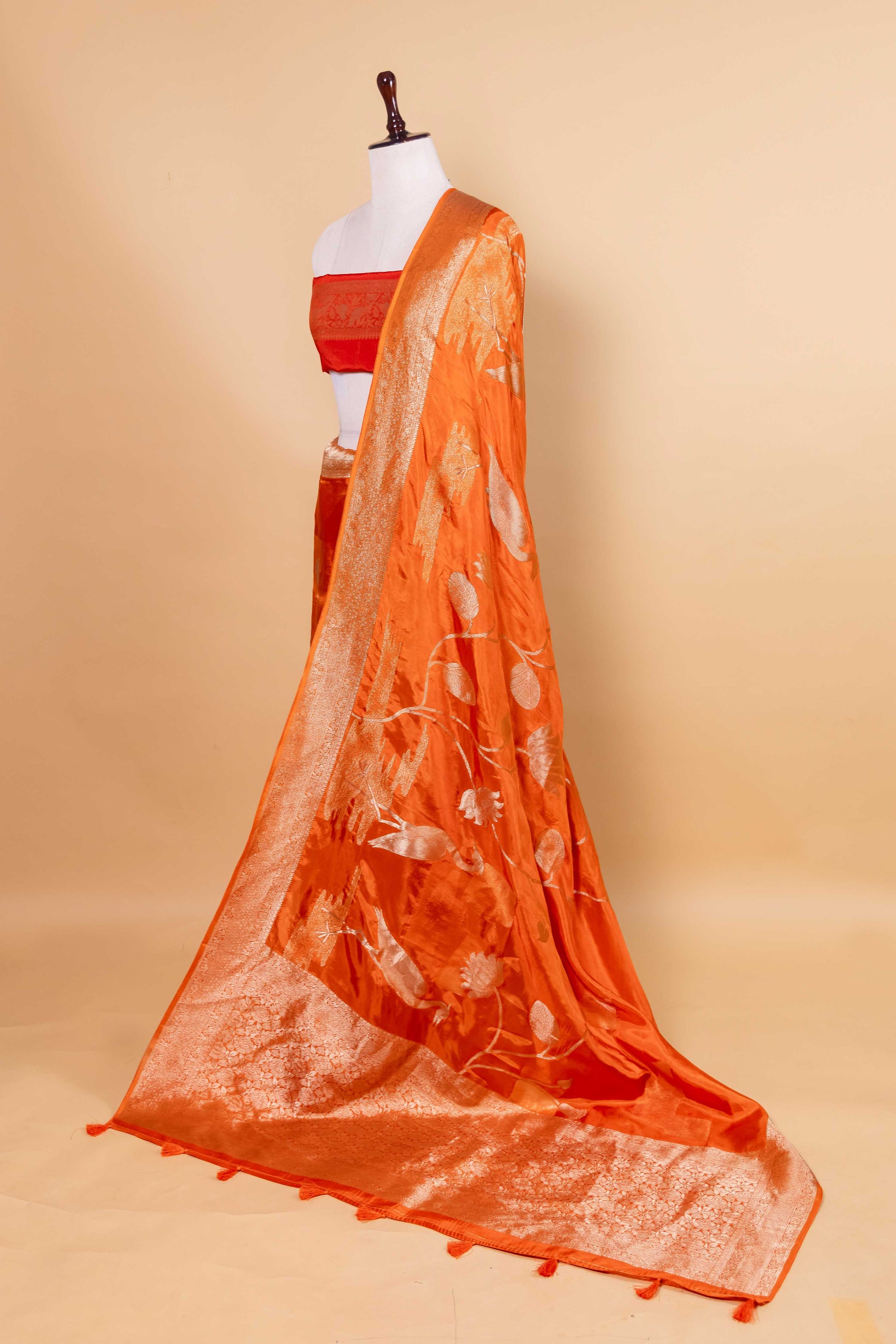 Radiant Saffron Zari Woven Fancy Silk Saree made from soft viscose silk, adorned with intricate gold zari weaving. The saree features a luxurious rich weaving pallu that enhances its traditional charm and elegant appeal, making it an ideal choice for festive occasions and special celebrations.