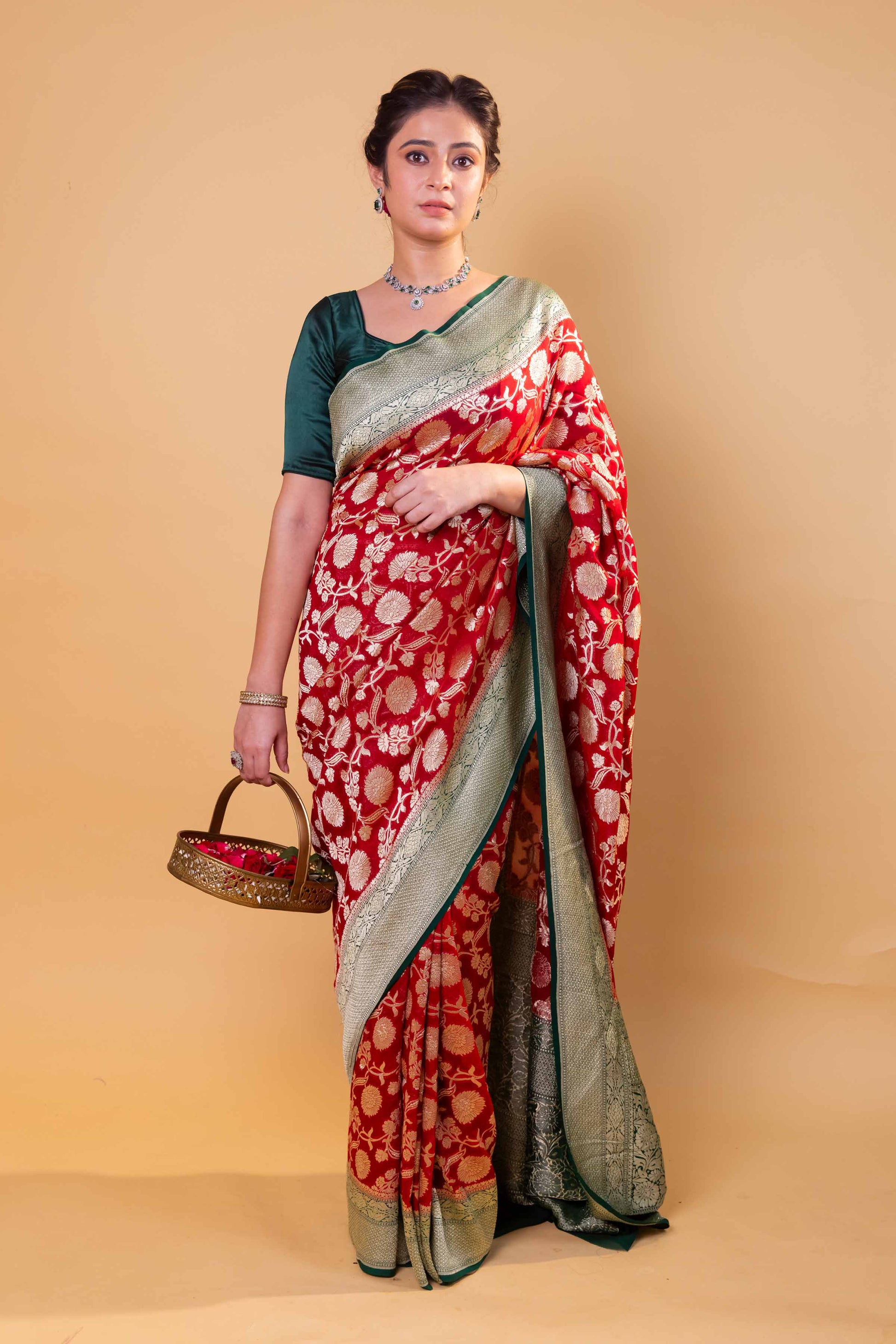 A graceful Khaddi Georgette Silk saree in vibrant red and green, featuring soft fabric, intricate water zari weaving, and a beautifully crafted rich pallu. Adorned with exquisite water-gold zari jall weaving and finished with a hand-dyed touch, it offers timeless Banarasi charm and finesse.