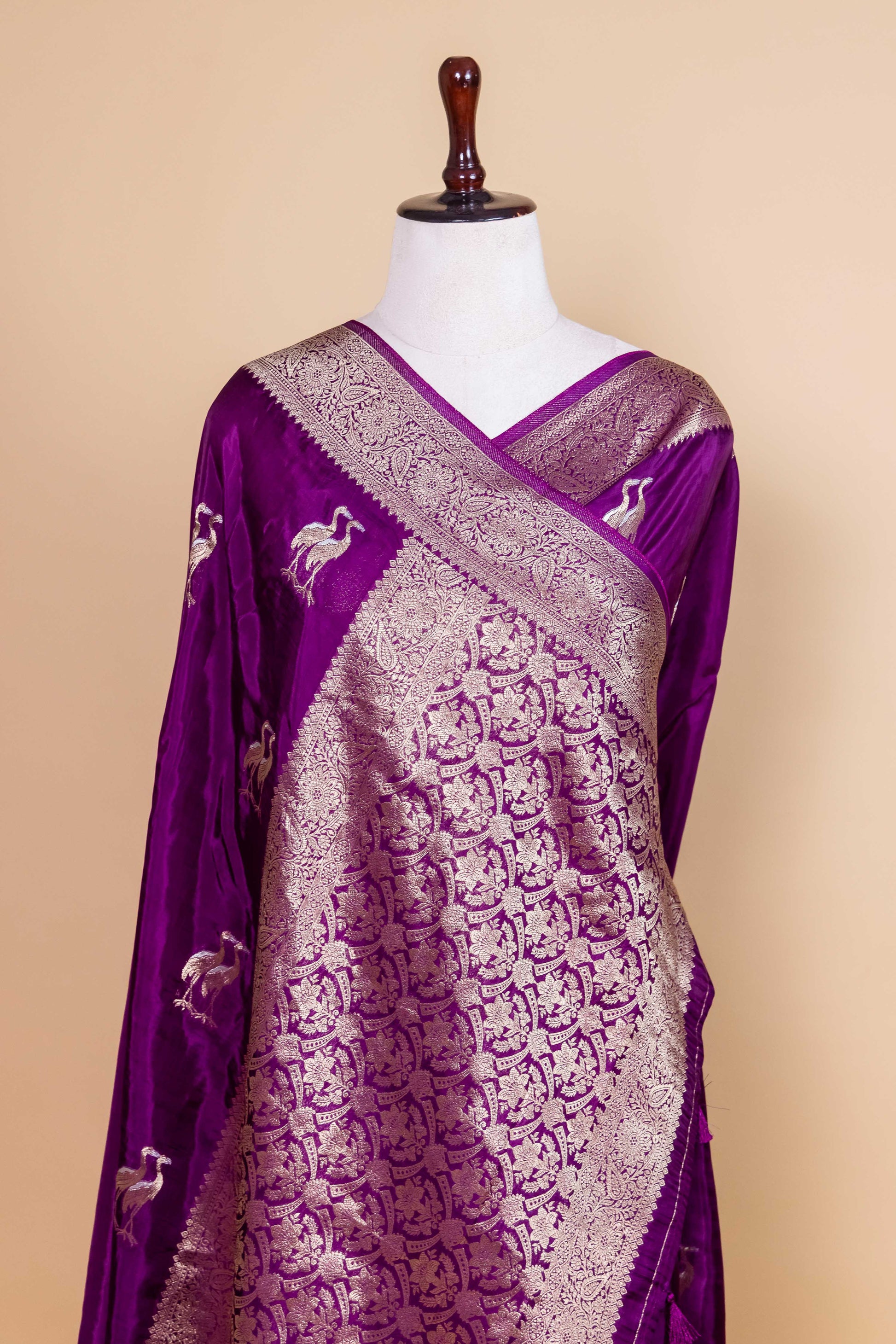 Purple Swan Weaving Silk Saree — Crafted from soft viscose silk, this elegant saree features exquisite silver and gold zari weaving with graceful swan figure buta motifs across the body. Finished with delicate tassels, it beautifully combines traditional craftsmanship with luxurious charm, perfect for festive occasions.