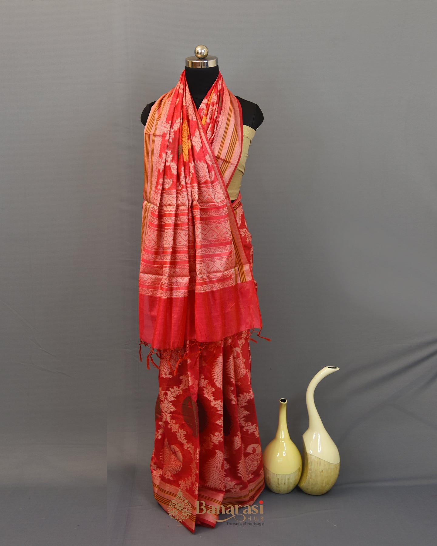 The Rani Pink Peacock Woven Cotton Banarasi Saree is a stunning masterpiece, blending tradition with contemporary elegance. Intricately woven peacock motifs grace the rich, rani pink cotton fabric, creating a regal ensemble. This saree exemplifies the timeless beauty of Banarasi craftsmanship, making it a symbol of grace and sophistication.
