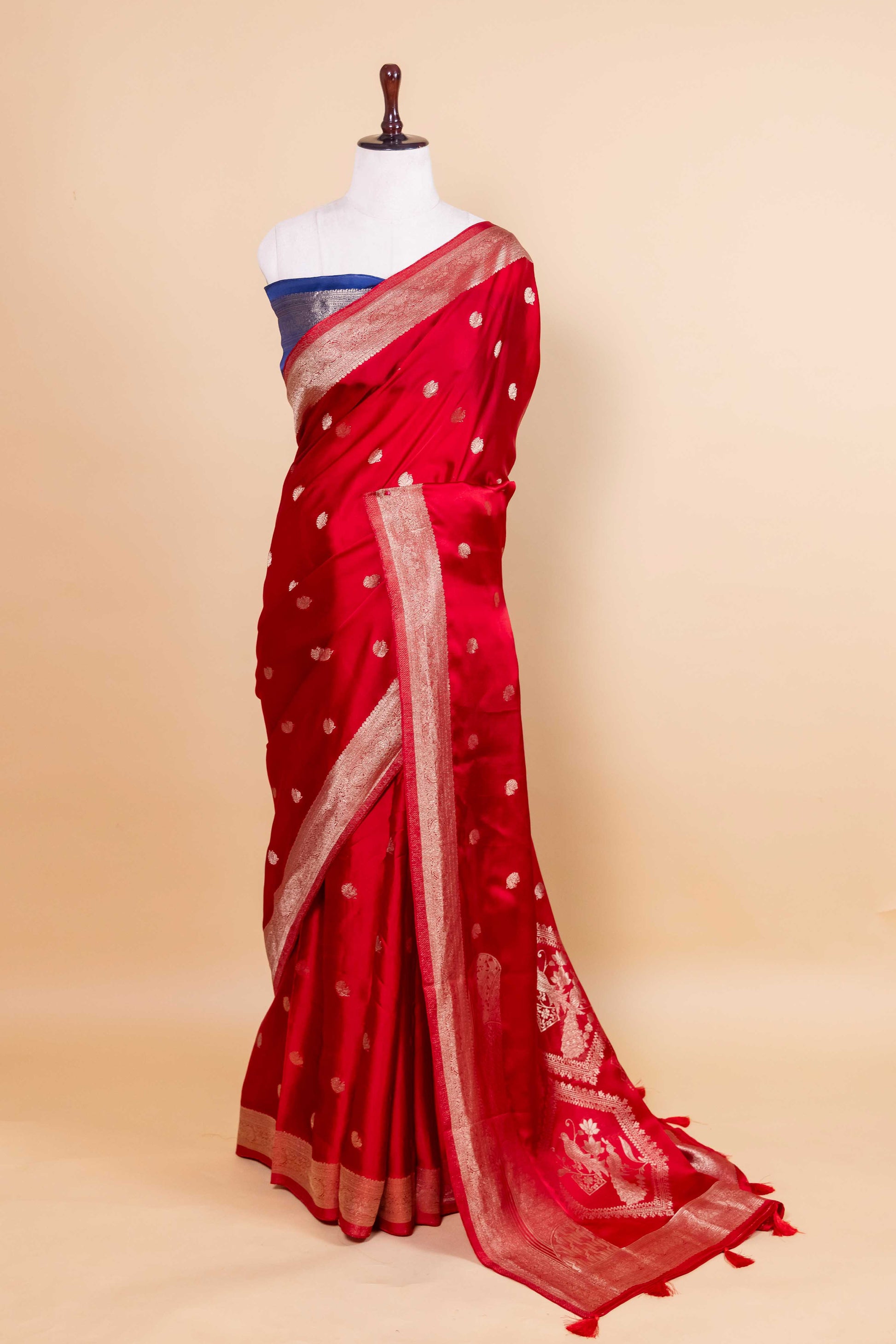 Exude timeless grace with this Red Bird Weaving Satin Silk Saree, adorned with intricate gold zari weaving and elegant zari buti motifs. Made from soft viscose silk, it features a richly woven pallu, combining luxurious texture with classic charm — perfect for festive and special occasions.