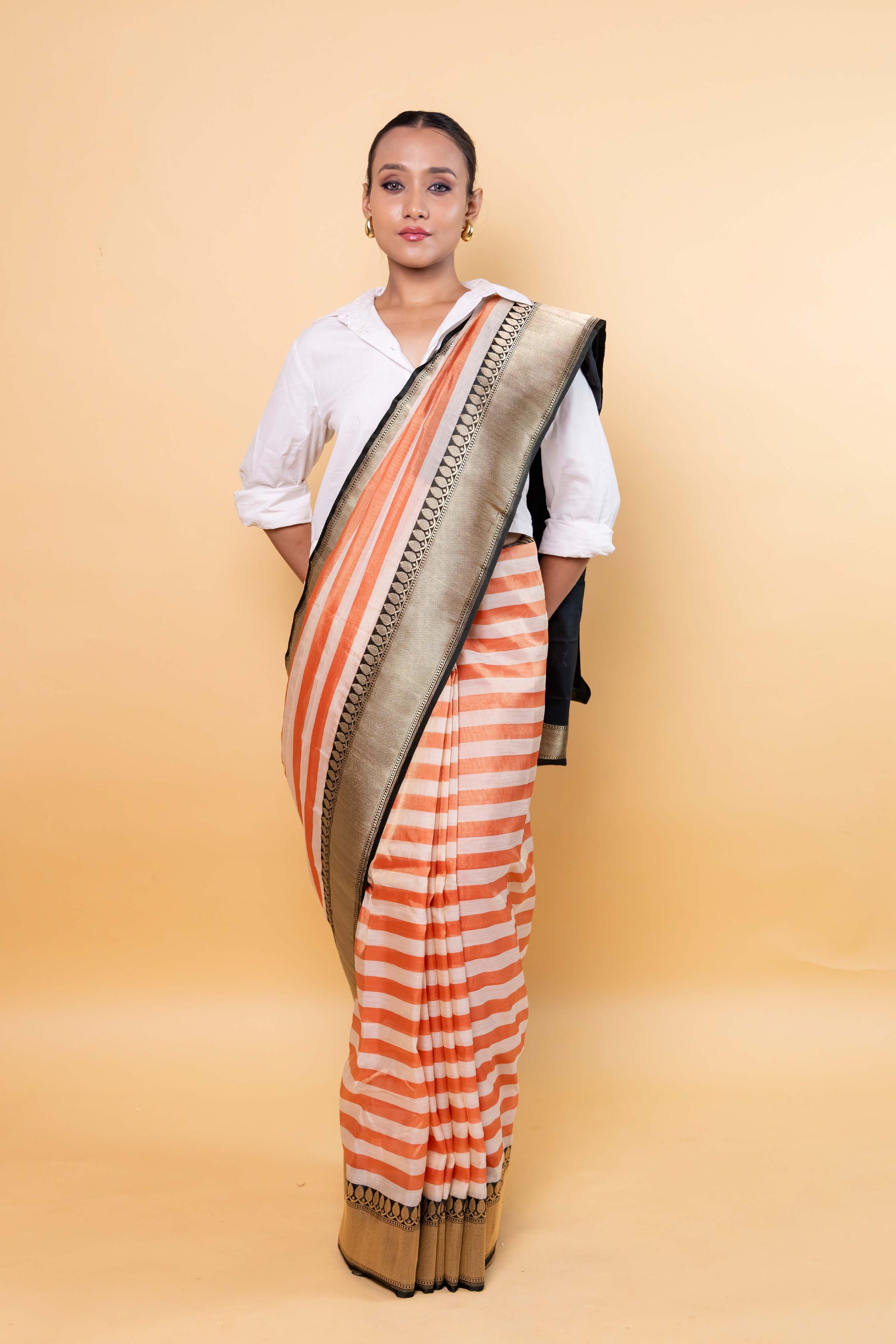 Beige & Orange Stripe Tissue Silk Saree – A charming tissue silk saree featuring beige and orange stripes, highlighted with a beautiful embroidery border and a striking contrast black edge. The richly woven pallu and soft, lightweight fabric create an elegant drape, making it perfect for festive occasions and special gatherings.