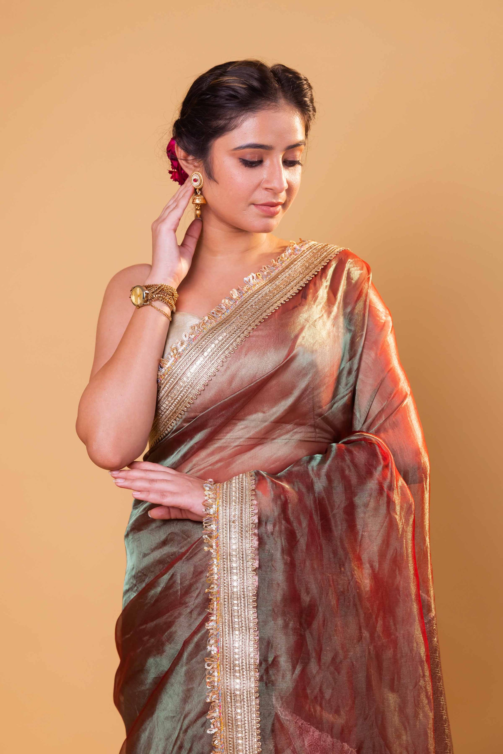 A radiant Pure Tissue Silk saree in a beautiful green dhup-chav shade, crafted with soft, lightweight fabric and a richly woven pallu. The water zari weaving border adds a subtle, elegant sheen, while the embellished lace enhances its festive charm. Paired with a luxurious brocade blouse for a complete, regal look.