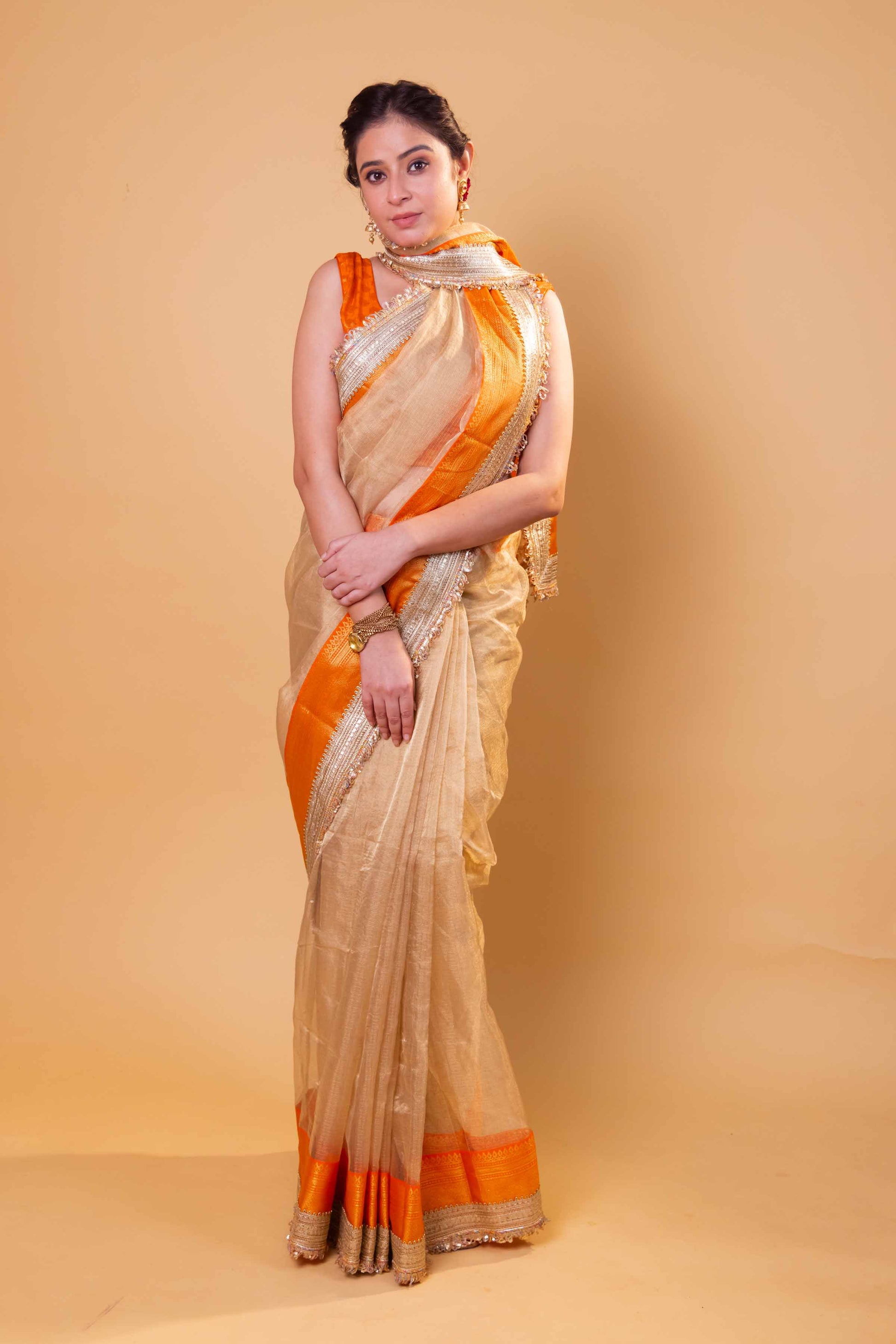 A luxurious Tissue Silk saree in shimmering gold, crafted from soft Kota checks fabric. Adorned with delicate embroidered lace and a classic Banarasi weaving border, this saree blends contemporary design with traditional elegance—perfect for festive occasions and sophisticated styling.