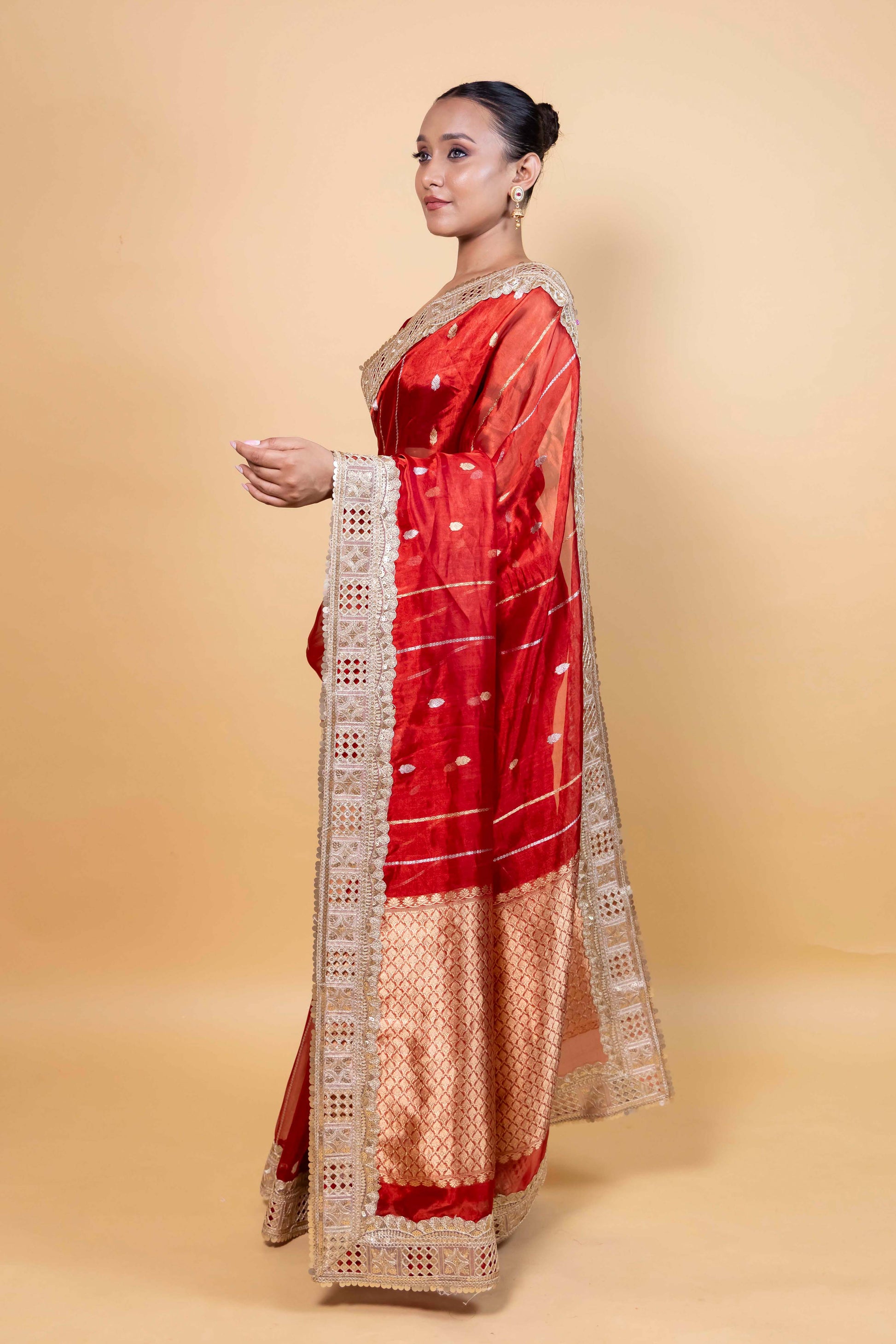 Red Cocktail Tissue Silk Saree – A vibrant red tissue silk saree adorned with delicate Sona Rupa zari weaving on the body, subtle small butis, and elegant stripe patterns. The intricately embroidered lace and richly woven pallu add a luxurious touch, while the soft, lightweight fabric ensures graceful drape for festive and formal occasions.