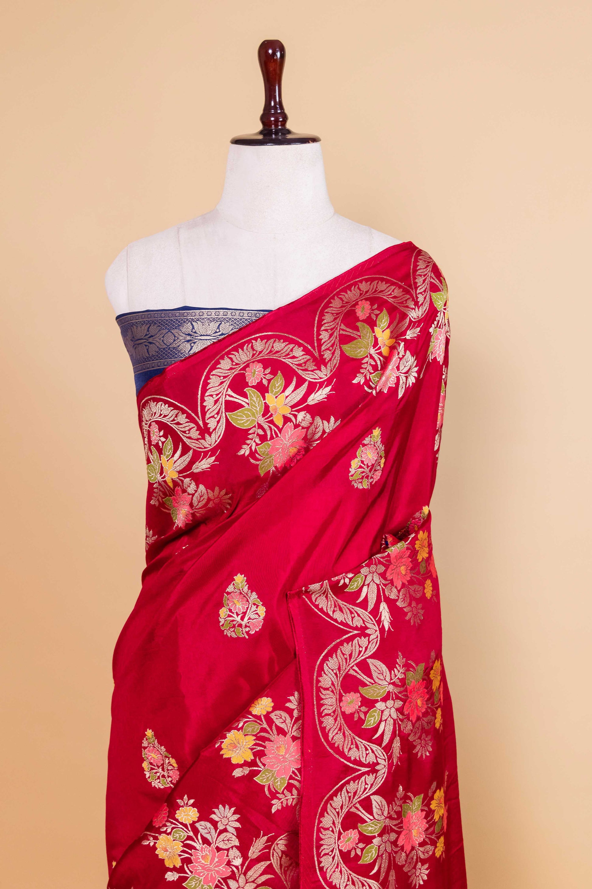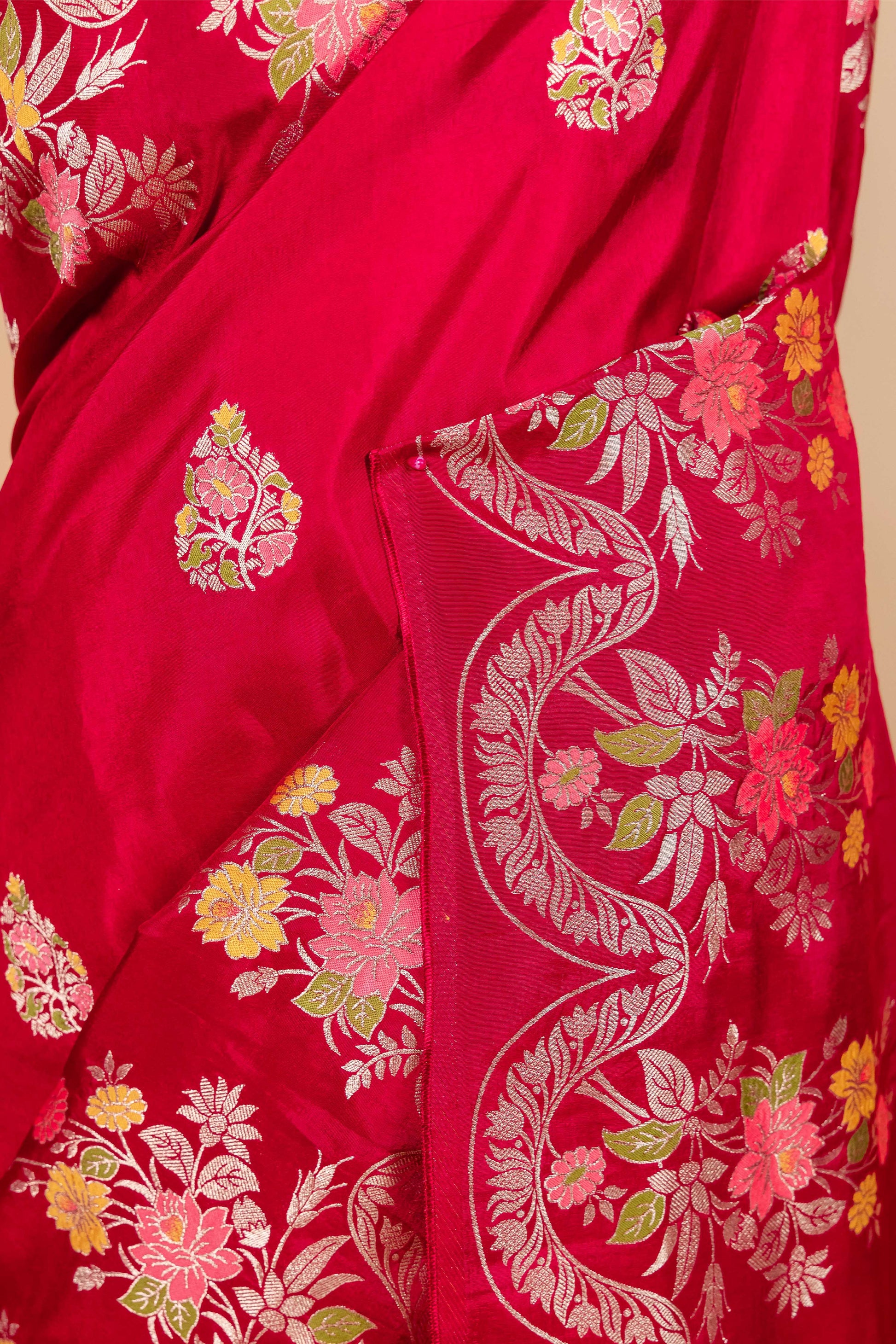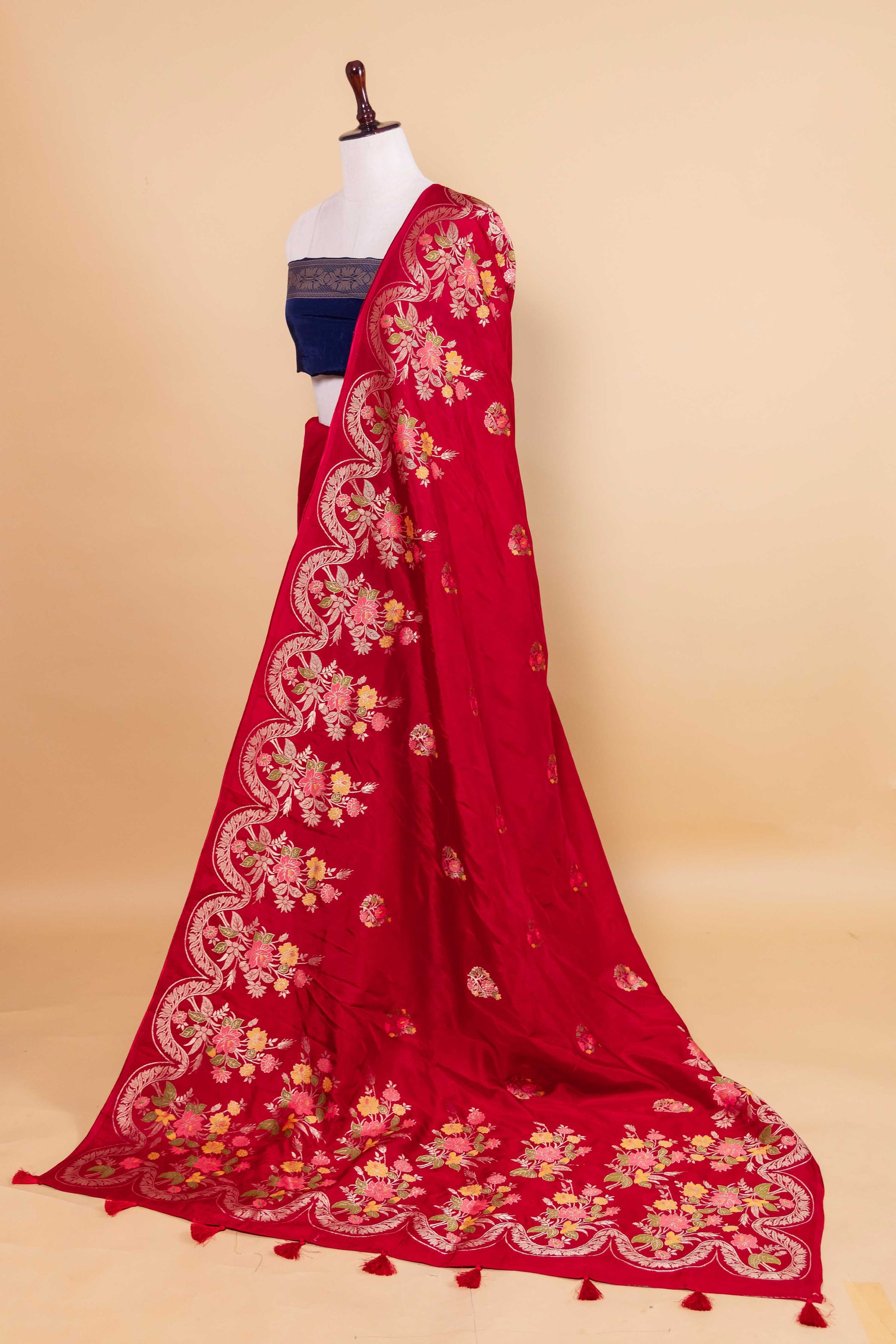 Gorgeous Ruby Red Floral Russian Silk Saree crafted from soft viscose silk, featuring intricate gold zari weaving. The saree is beautifully adorned with multi-color floral resham buta weaving and complemented by a rich weaving pallu, exuding elegance and sophistication—perfect for festive and special occasions.