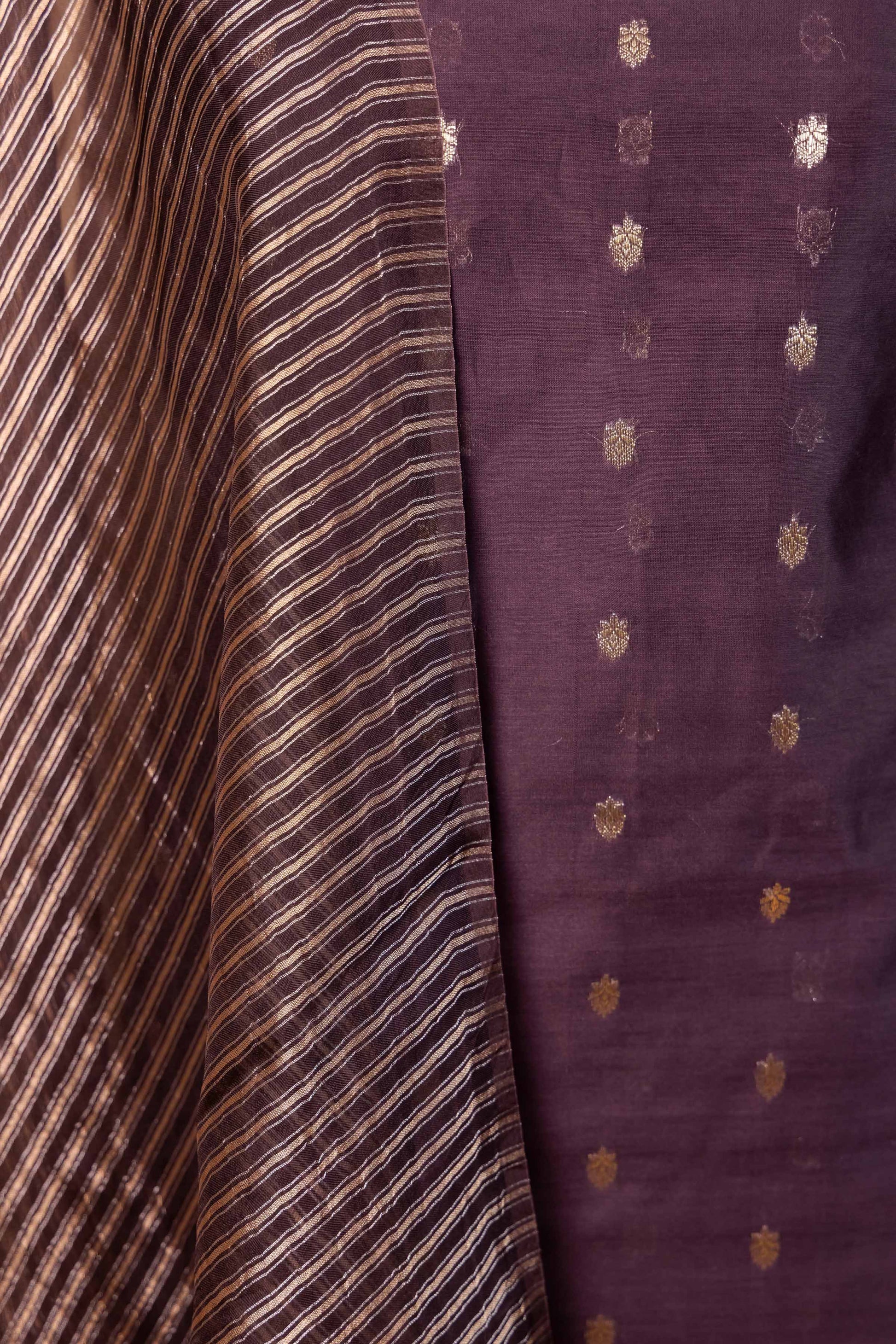 Brown Woven Chanderi Silk Suit with Stripe Dupatta featuring golden zari buti weaving on the kurta, paired with an organza dupatta adorned with silver and gold stripes and tassels, and a plain cotton bottom. This elegant ensemble blends traditional craftsmanship with contemporary style, perfect for festive or semi-formal occasions.