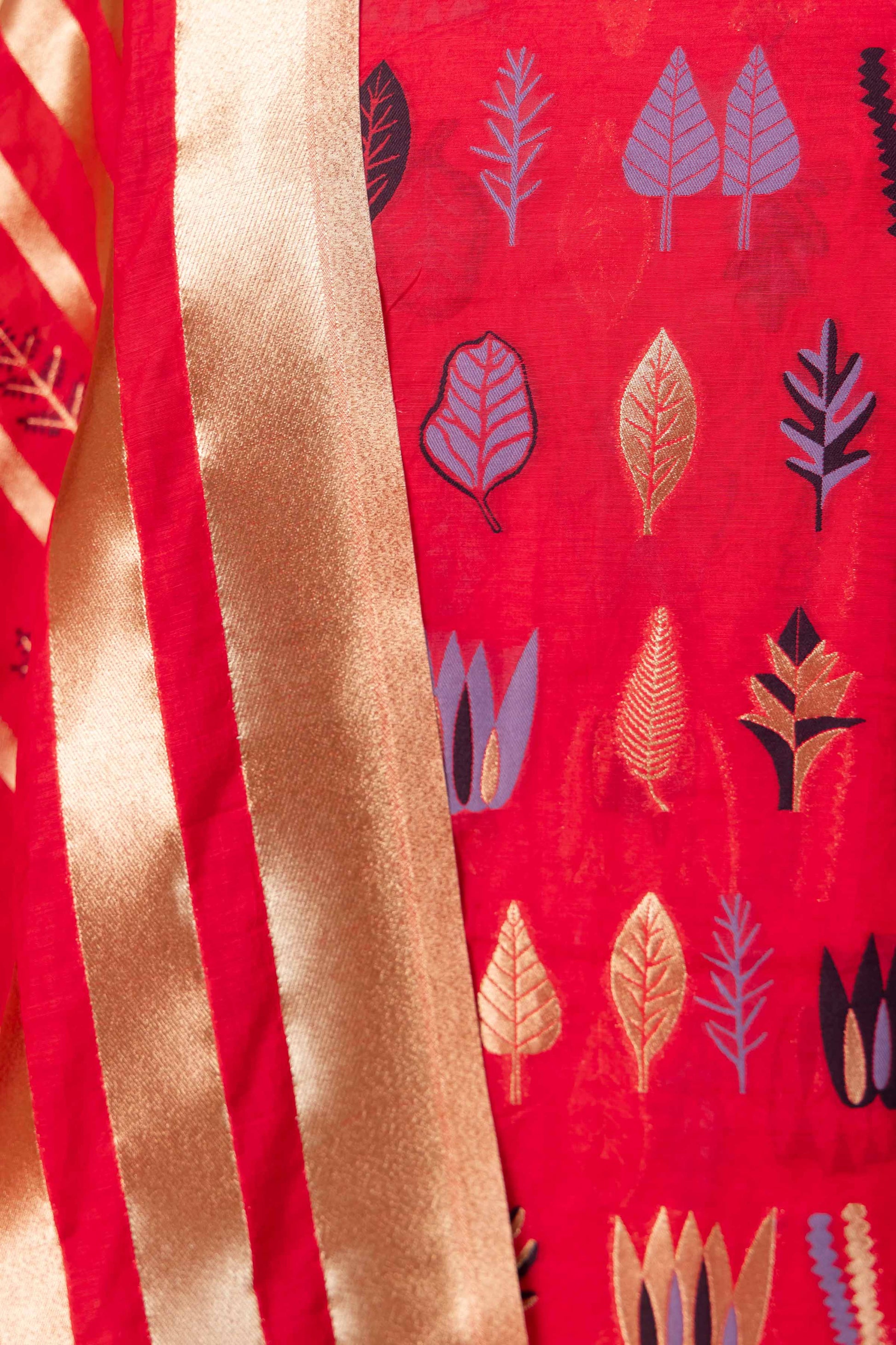 Red Floral Weaving Chanderi Suit featuring resham and water zari floral weaving on the kurta, paired with a woven dupatta and a plain cotton bottom. This vibrant ensemble blends traditional craftsmanship with comfort, making it perfect for festive and semi-formal occasions.